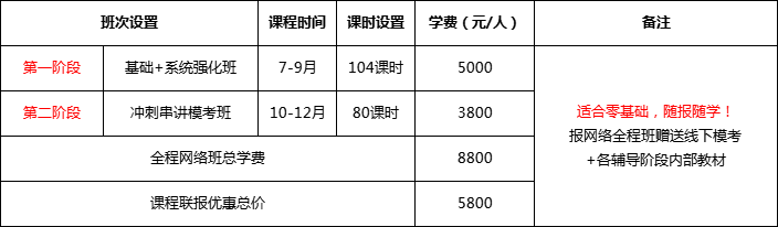 基礎班:循序漸進,理清各科考點;夯實基礎,做到溫故知新; 穩(wěn)扎穩(wěn)打,構(gòu)建思維模式;透析考點,形成學習體系。系統(tǒng)班:全面復習,強化技巧;系統(tǒng)歸納,總結(jié)考點;結(jié)合真題,重點突破;運用技巧,快速解題。??即v班:突破重點題型,查漏補缺;體驗全真考場,調(diào)整心態(tài);分配答題時間,有的放矢;模擬強化訓練,總結(jié)規(guī)律;把握命題規(guī)律,預測考向考點歸納總結(jié),查漏補缺;預測命題態(tài)勢,輕松上陣。報全程面授班:基礎班+系統(tǒng)強化班+沖刺串講??及?13800元/生。7月13日前報班享特大優(yōu)惠價8800元/人(贈送價值5800元全程視頻課+各輔導階段內(nèi)部資料)。1、報全程網(wǎng)絡班:基礎班+系統(tǒng)強化班+精講模串班=8800元。7月13日前報班享受特大優(yōu)惠價5800元/人。2、報網(wǎng)絡班送:贈送???各輔導階段內(nèi)部資料。3、網(wǎng)絡視頻課針對沒有時間參加面授班學員,手機、電腦下載APP可自由安排時間學習,費用低,效率高。