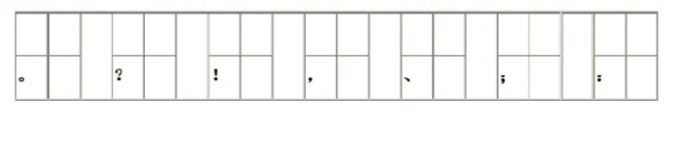 1、點號(句號。問號?感嘆號!逗號,頓號、分號;冒號:)的功能是表示語氣和停頓,必須緊接在原語句后面,如已寫到一行最后一格,應(yīng)把標(biāo)點貼著格的框線擠著寫進去,緊靠文字,不能提行寫在下一行開頭。
