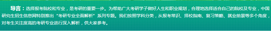 導(dǎo)言:選擇報(bào)考院校和專(zhuān)業(yè),是考研的重要一步。為幫助廣大考研學(xué)子做好人生和職業(yè)規(guī)劃,合理地選擇適合自己的院校及專(zhuān)業(yè),中國(guó)研究生招生信息網(wǎng)特別推出“考研專(zhuān)業(yè)全面解析”系列專(zhuān)題。我們按照學(xué)科分類(lèi),從報(bào)考常識(shí)、擇校指南、復(fù)習(xí)策略、就業(yè)前景等多個(gè)角度,對(duì)考生關(guān)注度高的考研專(zhuān)業(yè)進(jìn)行深入解析,供大家參考。